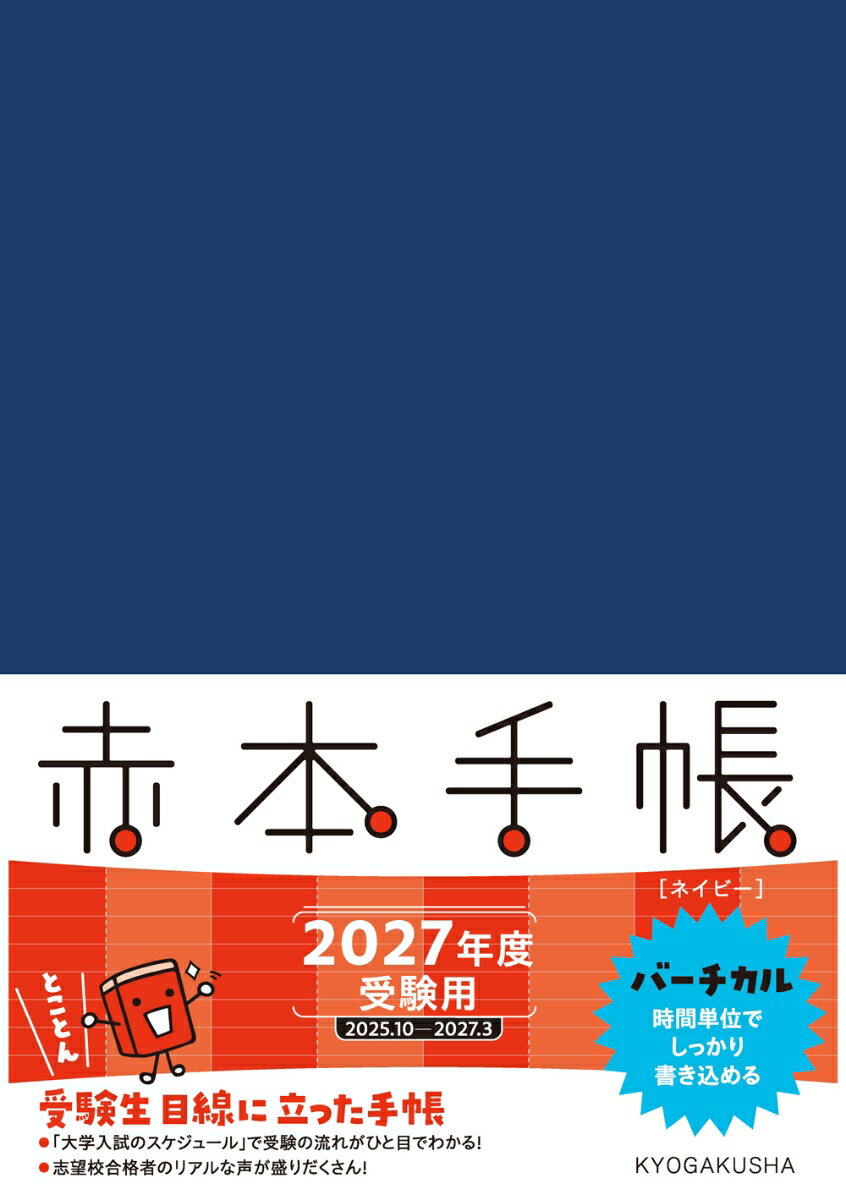 2025年10月始まり! 2027年3月まで使える! 受験に特化した手帳少しでも大学受験を意識したら…即、 『赤本手帳』!志望校合格者によるアドバイス、200本 以上!合格者の声から生まれた『赤本手帳』には、「合格者の知恵」が、たくさん詰まっています。合格のポイントやアドバイスなど、先輩のリアルな声が、受験をしっかりサポート!やっぱり一番参考になるのは、先輩受験生の声◎細かな予定が書き込める大きな《バーチカル》版!赤本手帳を使った先輩たちの「もっと緻密な計画を立てたい!」のリクエストを反映した バーチカル版 刊行!・見開き1週間のA5判サイズ。時間単位で予定を書き込むことができます。・1日の時間の使い方が視覚的・直感的に把握できます。・しおりひも2本つき・綿密なスケジュール管理で、合格に向けた道筋をしっかり立てることができます。◎《受験に役立つコンテンツ》が満載!・入試の流れが一目でわかる「大学入試のスケジュール」を掲載入試の基本的な流れを知った上で、自分の入試での必要な準備をしよう・受験のことがわかるコラムや合格者のアドバイスが充実「赤本の効果的な使い方」「時間の上手な使い方」「スランプの抜け出し方」など・応援メッセージの書き込みページあり◎《自己管理を助けるコンテンツ》が満載!・志望校合格最大の秘訣は「何をするべきか判断し、実行すること」赤本手帳があれば、自分自身のゴール、今月・今週・今日の目標をつどつど 確認できる・志望校に入ったら、何をしたい?& 志望大学の受験には、何が必要?「なぜ自分はこの大学に行きたいのか?」を考えることが、受験のスタート入試対策の第一歩は「情報収集」。調べたら、赤本手帳にメモ!赤本に載っている情報も活用して、自分なりのゴールを見据えよう・先輩受験生の声が、モチベーションの維持に最適「記録する」習慣がつくと、その習慣が、未来の自分をサポートしてくれます。スマホにメモするだけでは流れていってしまって振り返りづらいけれど、1冊の手帳に勉強の記録を貯めていけば、「自分の成長のあかし」が可視化されて、自信につながる!とことん受験生目線に立った『赤本手帳』で、「自分だけの受験スケジュール」を立てて、がっちり合格を勝ち取りましょう!