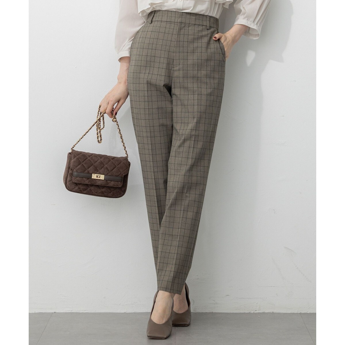 センタープレスが入ったきれいめテーパードシルエットのチェック柄パンツ。細身のシルエットで足元をスッキリと見せてくれ、きちんとした印象を与えてくれる1本。ウエストの後ろはゴム仕様で穿きやすいつくりにしています。シャツやブラウスと合わせてきれいめなオフィススタイルにはもちろん、ざっくりとしたニットと合わせてカジュアルなスタイリングにも幅広く合わせていただけます◎。シーズン問わず穿きやすい素材のうえに、シンプルで合わせやすくデイリー使いとして重宝する一枚です。カラーは秋らしいブラウンチェック(#335)の1色展開です。