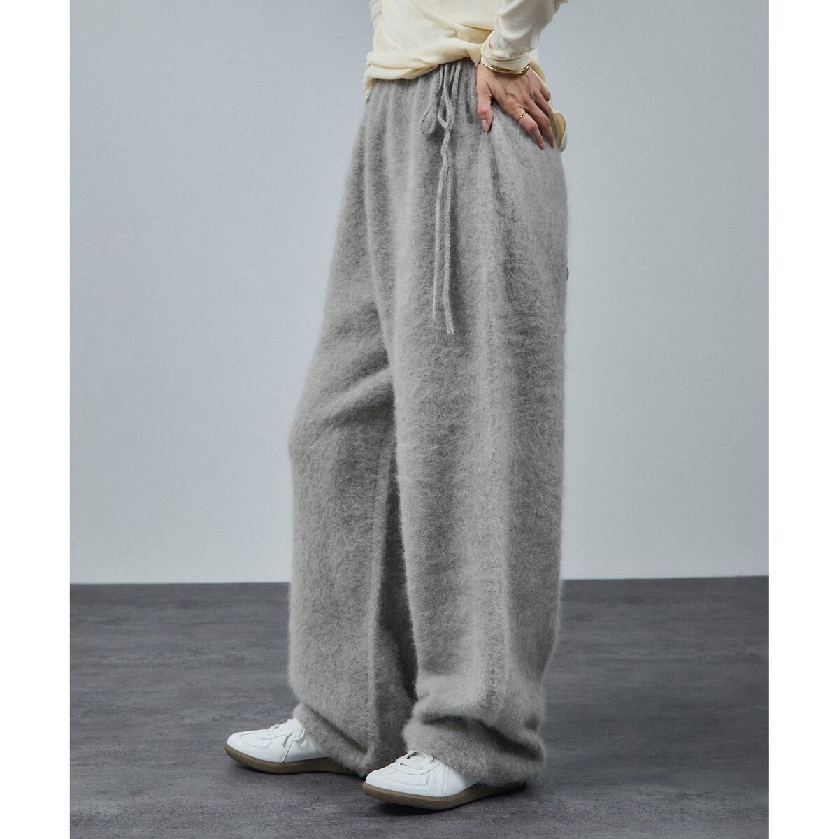 ふわっと柔らかな風合いと快適な穿き心地が魅力のワイドシルエットニットパンツ。