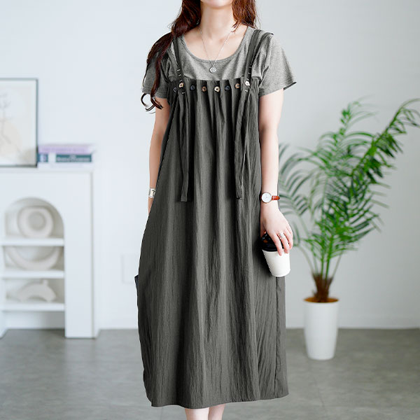 シンプルTシャツと、ボタン×プリーツデザインが映えるジャンパースカートの2点セットです。ゆるやかなAラインのロング丈シルエットで自然と縦ラインを強調。フロントのボタン使いや胸下のタック入りデザインが目線を上に☆気になるお腹まわりや腰回りをすっきり見せてくれる優秀シルエット。柔らかく伸びのあるカットソーTシャツはシンプルで単品でも着回し可能。セットでも単品使いでもバランスよく着こなせるのがポイント。どこから見ても抜かりなく、そっと自信をくれるセットアップです。