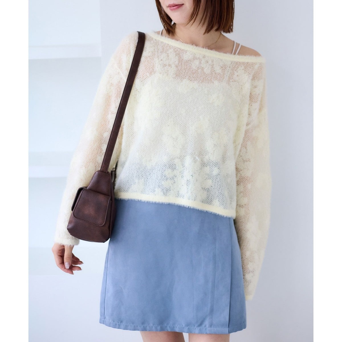 ぼかしたフラワーモチーフと細かいメッシュ編みにやわらかいフェザーを使用しています。
