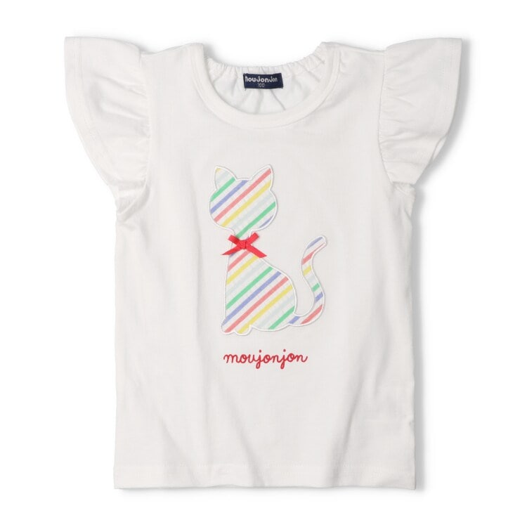 カラフルなストライプ柄のねことりんごのアップリケが可愛い!リボンのモチーフもポイント!フレアーな袖も女の子らしい半袖Tシャツ。襟ぐり後ろ部分はゴム仕様になっているので、着脱も楽ちん!【アイテム】トップス シンプル ガーリー フェミニン カジュアル お洒落 オシャレ かわいい 可愛い 普段着 デイリーウェア お出かけ着 お外着 お外遊び着 子ども こども 女児 女の子 ガールズ キッズ ベビーサイズ トドラーサイズ 幼稚園 保育園 小学校 通園 通学 小学生 2025年春夏物新作 丸高衣料 猫 ネコ リンゴ 動物 アニマル 果物 フルーツ コットン100% 綿100% ホワイト 白色 レッド 赤色 ムージョンジョン りぼん