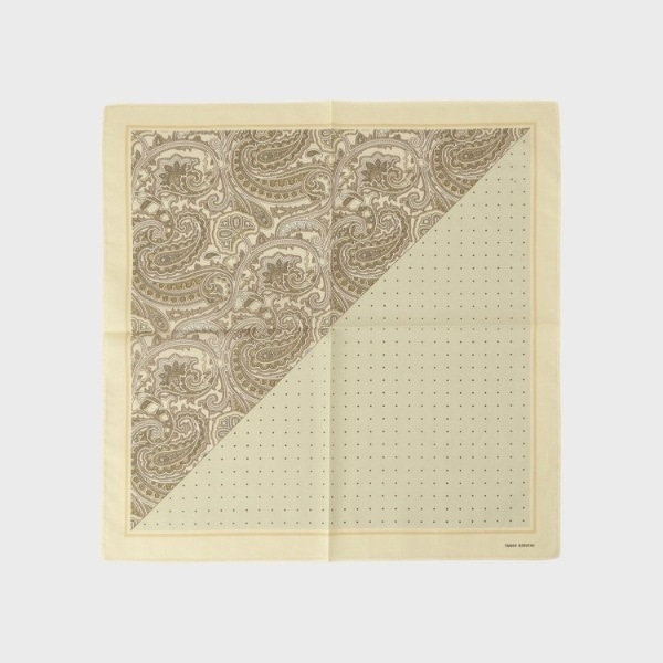 ペイズリー・ドットとトラディショナルな柄を斜めに切り替えた遊び心あるデザインのプリントハンカチ。
