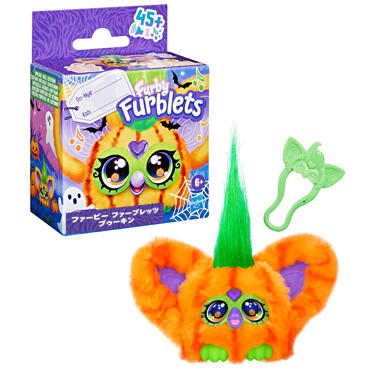 ■商品の主な特徴【ミニサイズのファービーのともだち】いつもいっしょ〜♪マイベストフレンド!ちっちゃなファービー ファーブレッツはそれぞれ違うデザインで、得意な曲のスタイルがあるよ!プレゼントにぴったりのかわいいミニギフトです!【45種類以上の音や歌の組み合わせで反応】ブゥーキンはハロウィンが大好き!ハロウィンっぽいミュージックを演奏したり、ファービー語でおもしろいフレーズをおしゃべりするよ。LR44型ボタン電池3個使用(デモ用電池付属)。【ファーブレッツとの遊び方】口やハートボタンを押したり、頭のあたりをポンッてすると、ファービー語でおしゃべりしたり、歌を歌ったり曲を演奏してくれるよ。頭を長押しするとスリープモードになるよ。【他のファーブレッツとのハーモニー(各別売)】ファーブレッツはそれぞれ違うデザインで、得意な曲のスタイルがあるよ。他のファーブレッツと一緒に歌うこともできるよ!【おでかけに便利なクリップ付き】約5cmのかわいいミニファービーはクリップ付きなので、バッグに取り付けて一緒におでかけできるよ。【かわいい耳がポンって開くよ!】耳が閉じている状態で頭のあたりをポンッて押すと耳が開くよ。耳をたたむと閉じた状態に戻るよ。【ファービーとのおしゃべり(各別売)】 2024年以降版のファービーを持ってる?ファーダーモードをオンしてみて。ファービーが、"ディ ヌゥーラー"(ちっちゃなともだち)のことをお話してくれるかも?■商品説明わぁ!ファービーのちっちゃなともだち!いつでもどこでも歌を歌ったり曲を演奏してくれるから、一緒に楽しく遊べるよ。口やハートボタンを押したり、頭のあたりをポンッてすると、45種類以上の音や歌、ファービー語の組み合わせで反応するよ!ファーブレッツはそれぞれ違うデザインで、得意な曲のスタイルがあるよ。ブゥーキンはパンプキンのデザインが特徴でハロウィンが大好き!クリップ付きなので、バッグに取り付けて一緒におでかけもできるよ。Furby and all related properties are trademarks of Hasbro.セット内容: ファーブレッツ本体、取扱説明書対象年齢6才以上 LR44型ボタン電池3個使用(デモ用電池付属)表面をやわらかい布でやさしく拭いてください。(c)2025 Hasbro. All rights reserved. 【対象年齢】:6歳以上