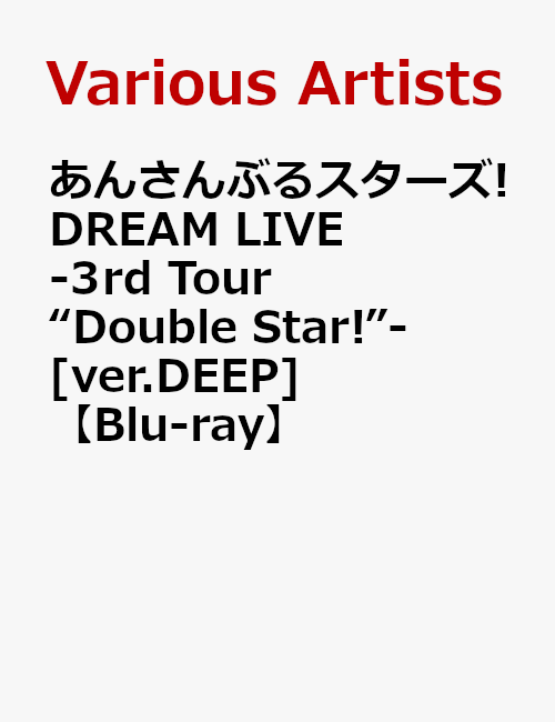 『あんさんぶるスターズ!DREAM LIVE -3rd Tour “Double Star!”-』BD & DVD発売決定!!<収録内容>『あんさんぶるスターズ!DREAM LIVE -3rd Tour “Double Star!”- ver.DEEP』 2019.3.30 幕張メッセ01.天下無敵☆メテオレンジャー!/流星隊02.流星花火/流星隊03.MC104.エメラルドプラネット/Switch05.Knockin' Fantasy/Switch06.MC207.Temptation Magic/Switch08.Gate of the Abyss/UNDEAD09.MC310.Valentine Eve's Nightmare/UNDEAD11.Play “Tag”/2wink12.MC413.HEART→BEATER!!!!/Trickstar14.MC515.CHERRY HAPPY STREAM/Trickstar16.MC617.SUPER NOVA REVOLU5TAR/流星隊18.MC7 19.アンリミテッド☆パワー!!!!!/流星隊20.Galaxy Destiny/Switch21.MC822.ハートプリズム・シンメトリー/2wink23.MC924.歓迎☆トゥ・ウィンク雑技団/2wink25.BREAKTHROUGH!/Trickstar26.MC1027.TRICK with TREAT!!/2wink with UNDEAD28.MC1129.DESTRUCTION ROAD/UNDEAD30.MC1231.Melody in the Dark/UNDEAD【Encore】32.Rebellion Star/Trickstar33.MC1334.ONLY YOUR STARS!/Trickstar※収録内容・仕様は予告なく、変更になる場合がございます。予めご了承ください。<キャスト>【ver.DEEP】Trickstar:氷鷹 北斗明星 スバル、遊木 真、衣更 真緒流星隊:守沢 千秋、深海 奏汰、南雲 鉄虎、高峯 翠、仙石 忍Switch:逆先 夏目、青葉 つむぎ、春川 宙UNDEAD:朔間 零、羽風 薫、大神 晃牙、乙狩 アドニス2wink:葵 ひなた、葵 ゆうた(C)2018 Happy Elements K.K/スタライ製作委員会