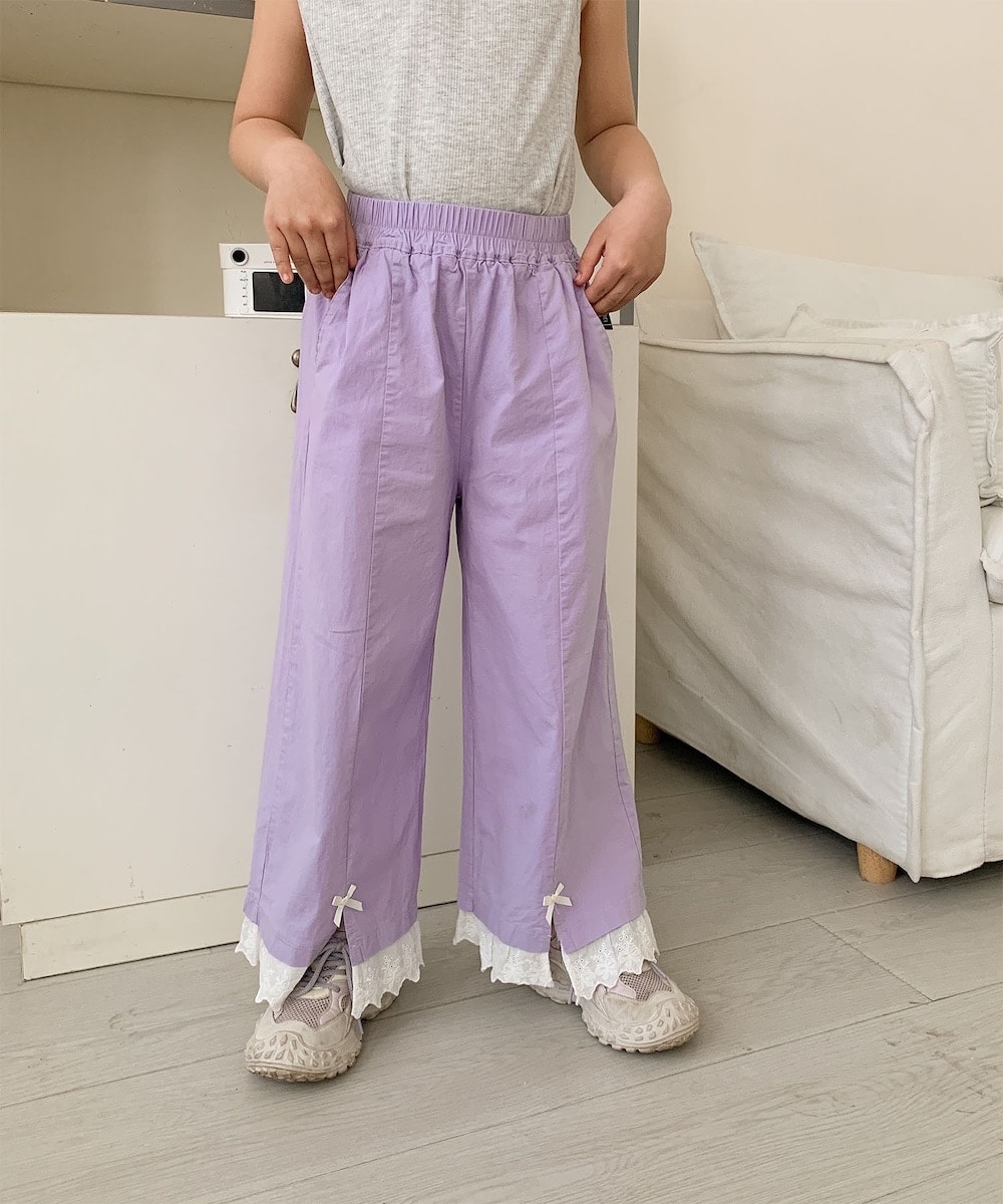 裾のレースと小さなリボンモチーフが可愛らしい、女の子向けワイドパンツ。動くたびに揺れる裾のレースが、ナチュラルでガーリーな印象を演出します。