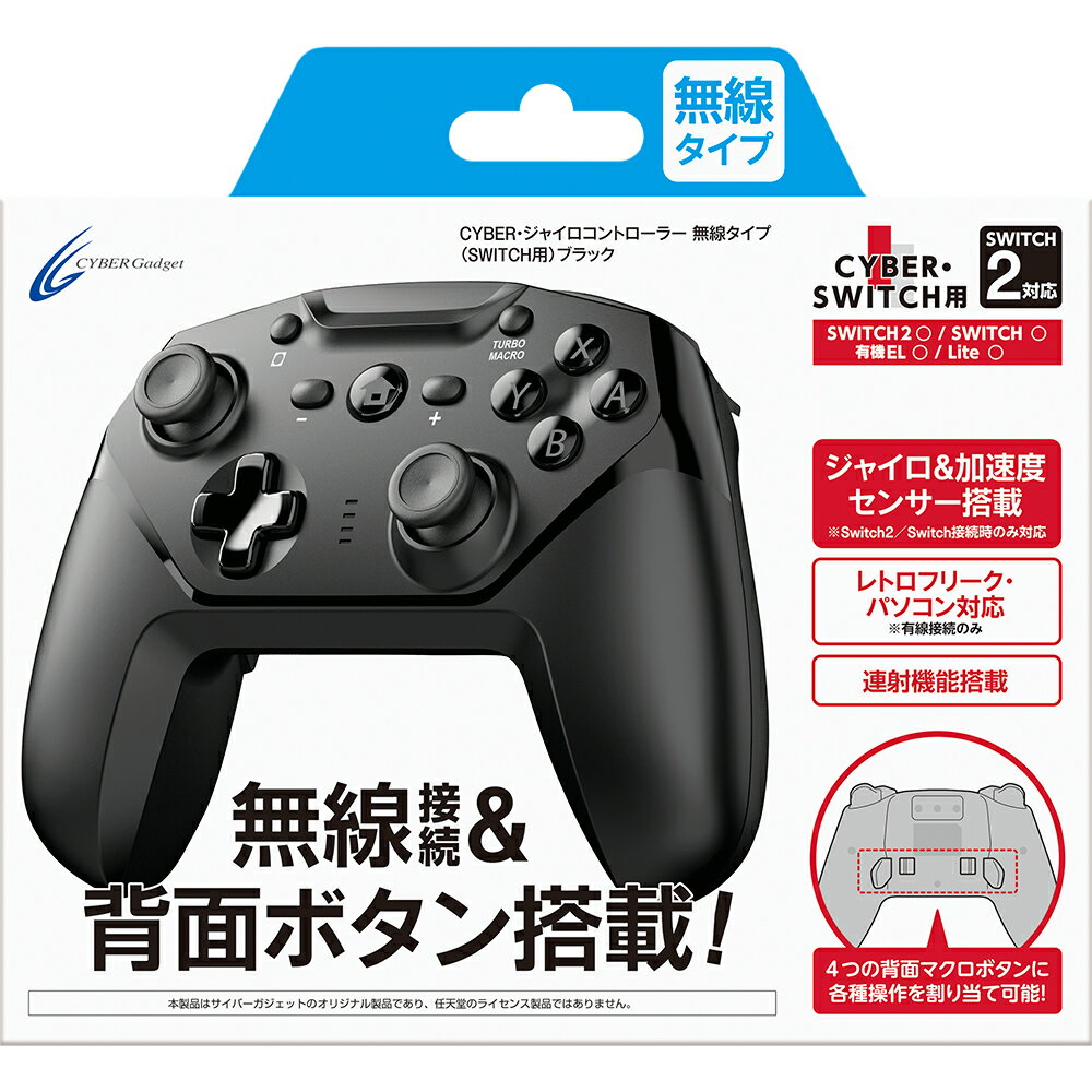 【ジャイロ・加速度センサー搭載の本格派コントローラー】流線形のグリップが持ちやすく、快適にプレイできるコントローラーNintendo Switchのジャイロ操作にも対応。別売『アナログスティックカバー ねこにゃん ( SWITCH Proコントローラー 用)』を装着可能です。【Bluetooth接続&USB接続両対応でさまざまな機器で使える】ゲーム機やモニターから離れて使用できる無線接続タイプ。ケーブルを繋げば有線タイプとしても使えます。パソコンでも使用でき、レトロフリークにも対応しています。【背面ボタン、連射ボタン搭載】コントローラー背面には各種ボタンを割り当てられるマクロボタンを4つ搭載。L3ボタンを割り当ててFPSで走りやすくしたり、さまざまな用途に活用できます。連射機能も搭載。「TURBO」ボタンを押すと1秒間13連射が可能です。【対応機種】Nintendo Switch 2 /Nintendo Switch/Nintendo Switch Lite/レトロフリーク/パソコン※TVモード以外での有線接続やNintendo Switch Liteに有線接続する際は別途変換コネクターなどが必要。※パソコン使用する場合の対応OSはWindows 8/10。※レトロフリークではUSB接続のみ使用可能。セット内容:ジャイロコントローラー 無線タイプ×1、USB充電ケーブル×1サイズ:約 125mm×155mm×80mm