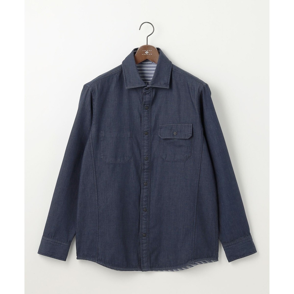 表裏で異なる2つの表情を楽しめるリバーシブル仕様表は無地のコットンデニム調シャンブレー、裏はストライプ柄。二重織り構造で1枚で2パターンの着こなしが可能です。