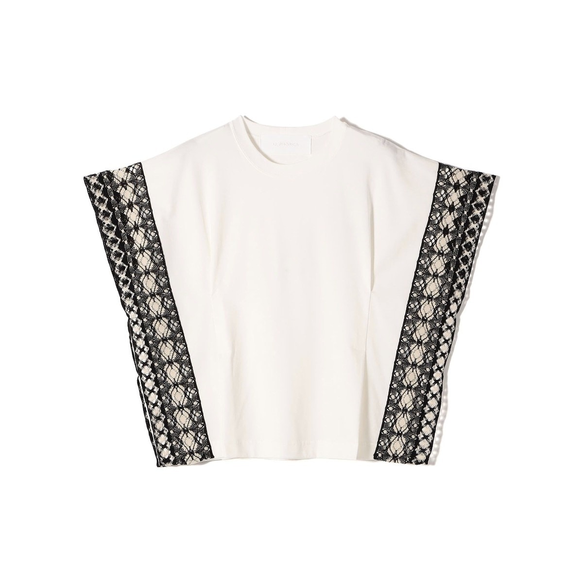 上質な光沢感のあるコットン原料を使用した40/2シルケット天竺にトーションレース2種類をドッキングしたポンチョ型カットソー。