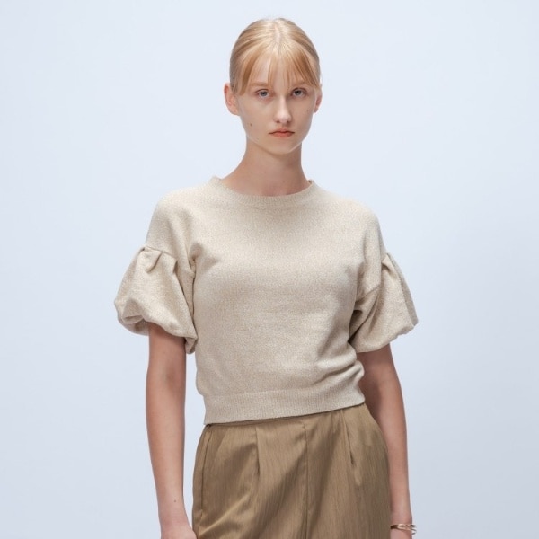 ・ふんわりとしたフリル風パフスリーブが女性らしさを引き立て、気になる二の腕をさりげなくカバー。