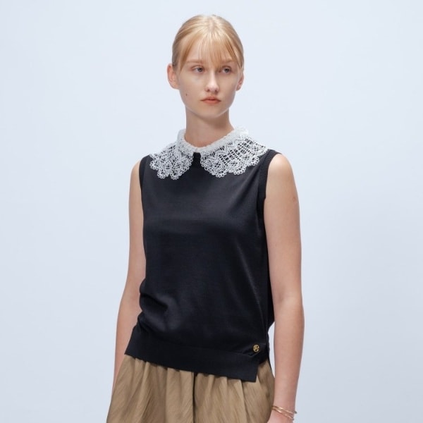 ・繊細なレース衿が目を惹く、上品でクラシカルな印象のノースリーブニットトップス。