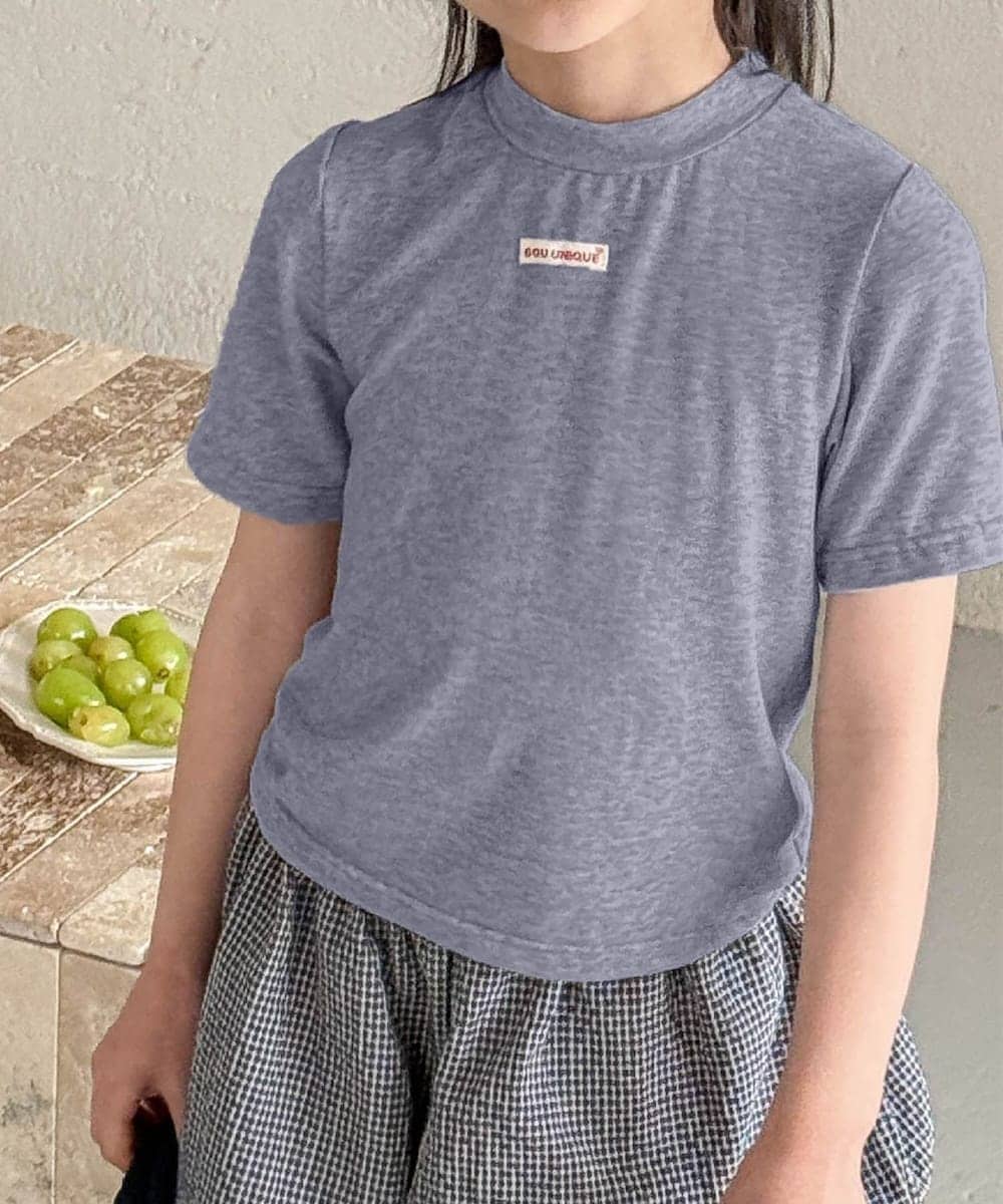 胸元には控えめなロゴ風パッチが施されており、シンプルながらもアクセントに。通園・お出かけ・普段着にぴったりな一枚です。