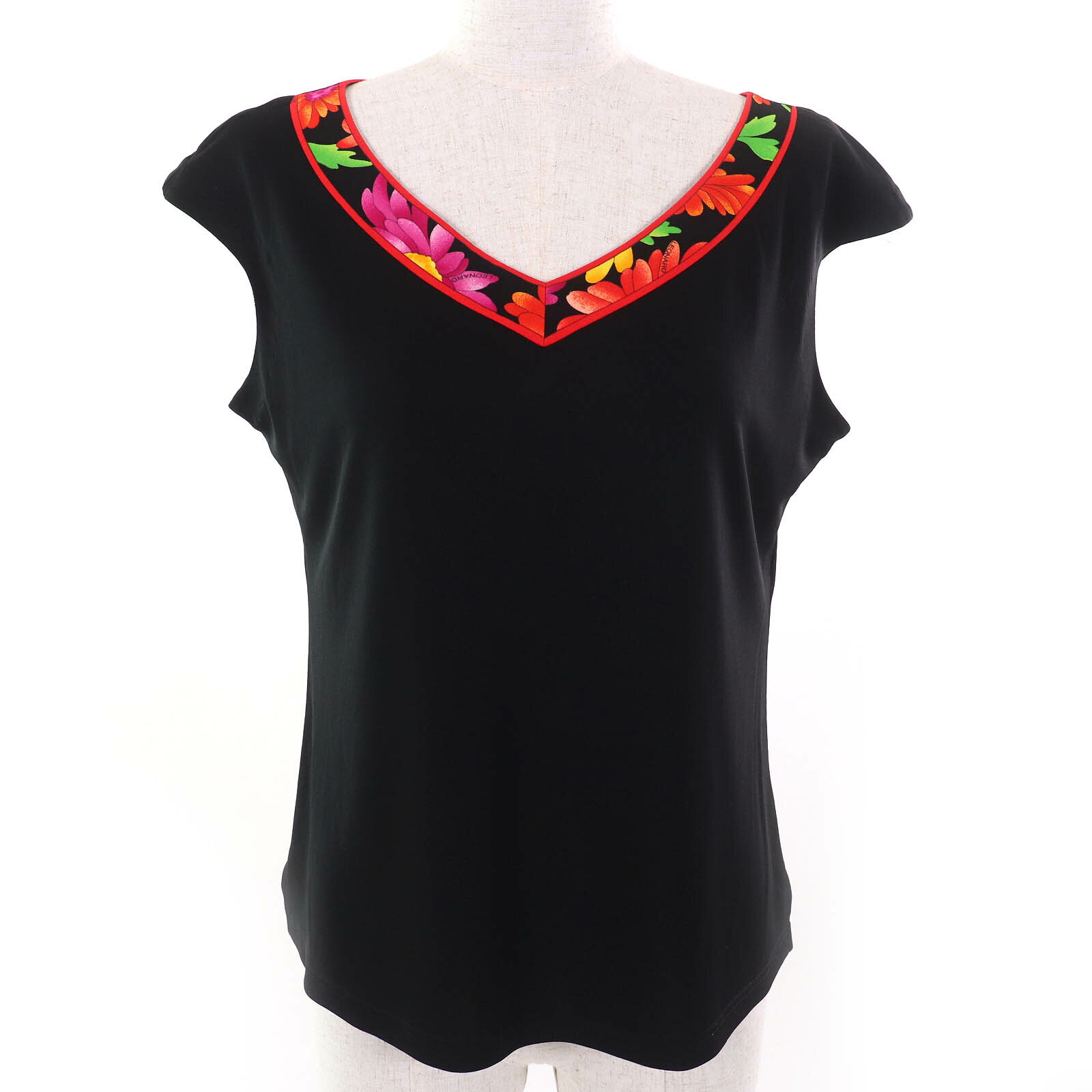 極美品★LEONARD レオナール 花柄 半袖 トップス カットソー ダークネイビー ピンク イエロー ブルー 38 正規品 レディース【中古】