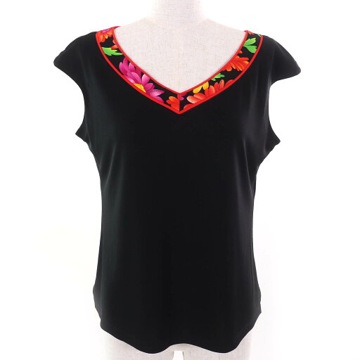 美品 LEONARD レオナール フラワープリント 七分袖 カットソー プルオーバー サイズL ブラック系 レディース 古着 中古 USED