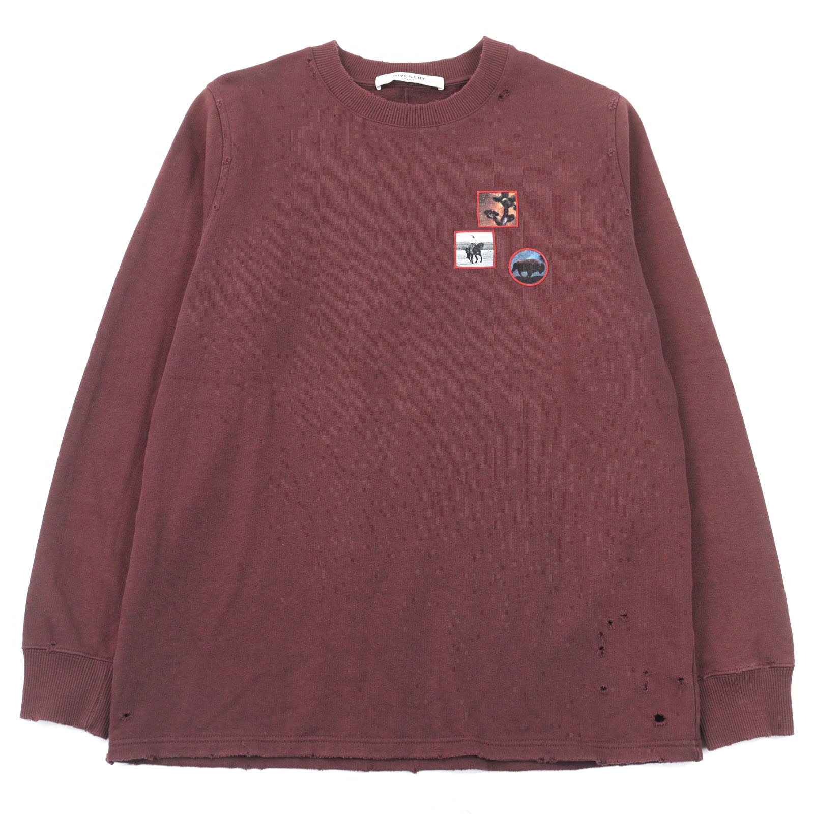 【ドンドン見直し】美品○GIVENCHY ジバンシィ 7151 653 コットン100% ワッペン付き デストロイ加工 クルーネック スウェット ボルドー XS 正規品 メンズ