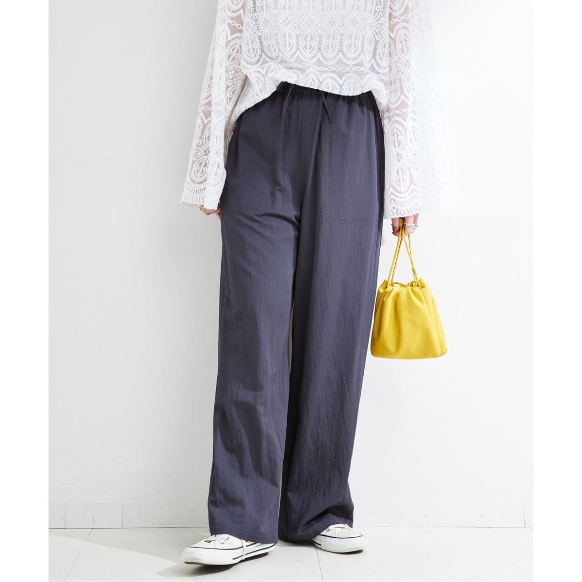 サテンほどとろみがなく程よいハリ感のあるセルロース系、微光沢なカルゼ目の涼しげな素材を使用しています。ワッシャー加工によるナチュラルなシワ感がこなれた印象で肌離れもよく、クセのないセミワイドストレートシルエットになります。
