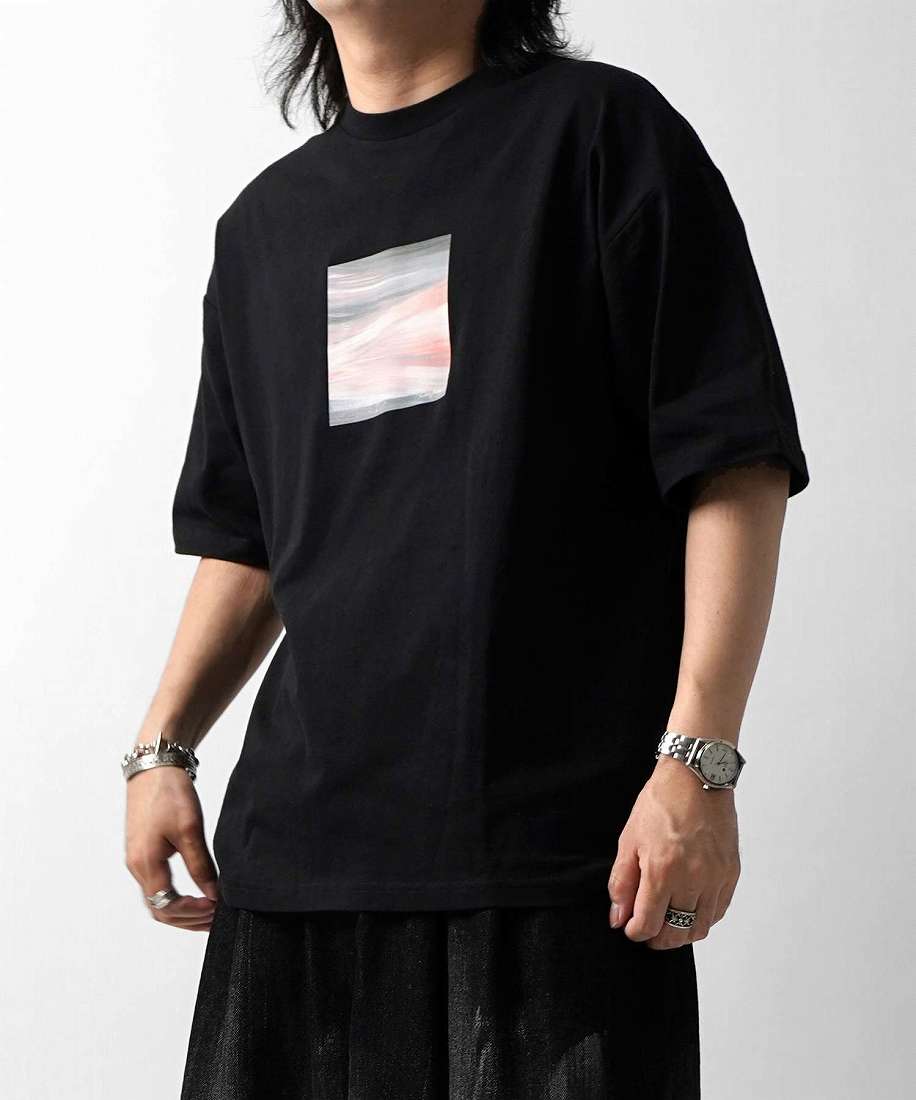 抽象的な絵画が目を引くシンプルなプリントTシャツ。