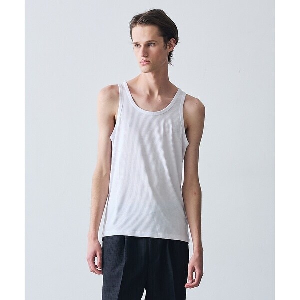 衿ぐりの中心から袖山の付け根までを広く取り、抜け感を表現したリブタンクトップ。アームホールを広く大きめにすることで、着用時の不快感を軽減したストレスフリーなサイズ感に仕上げました。インナー使いで品よく魅せる、大人のレイヤードスタイルに最適です。