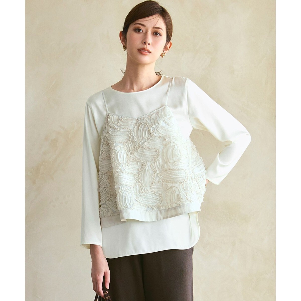 存在感のある立体的なリボン刺繍生地で作ったトッピングアイテムのキャミソール。ネックラインは浅めのVにすることで可愛らしくなりすぎず、すっきりとした印象になっているので、大人の女性に着て頂きやすいデザインです。インパクトのある意匠性がトレンド感を引き立てる1枚です。いつものカットソーやシャツにレイヤードするだけでこなれ感のあるスタイリングが叶います。カラーはシックなブラック(#005)と柔らかい印象のベージュ(#033)の2色展開です。