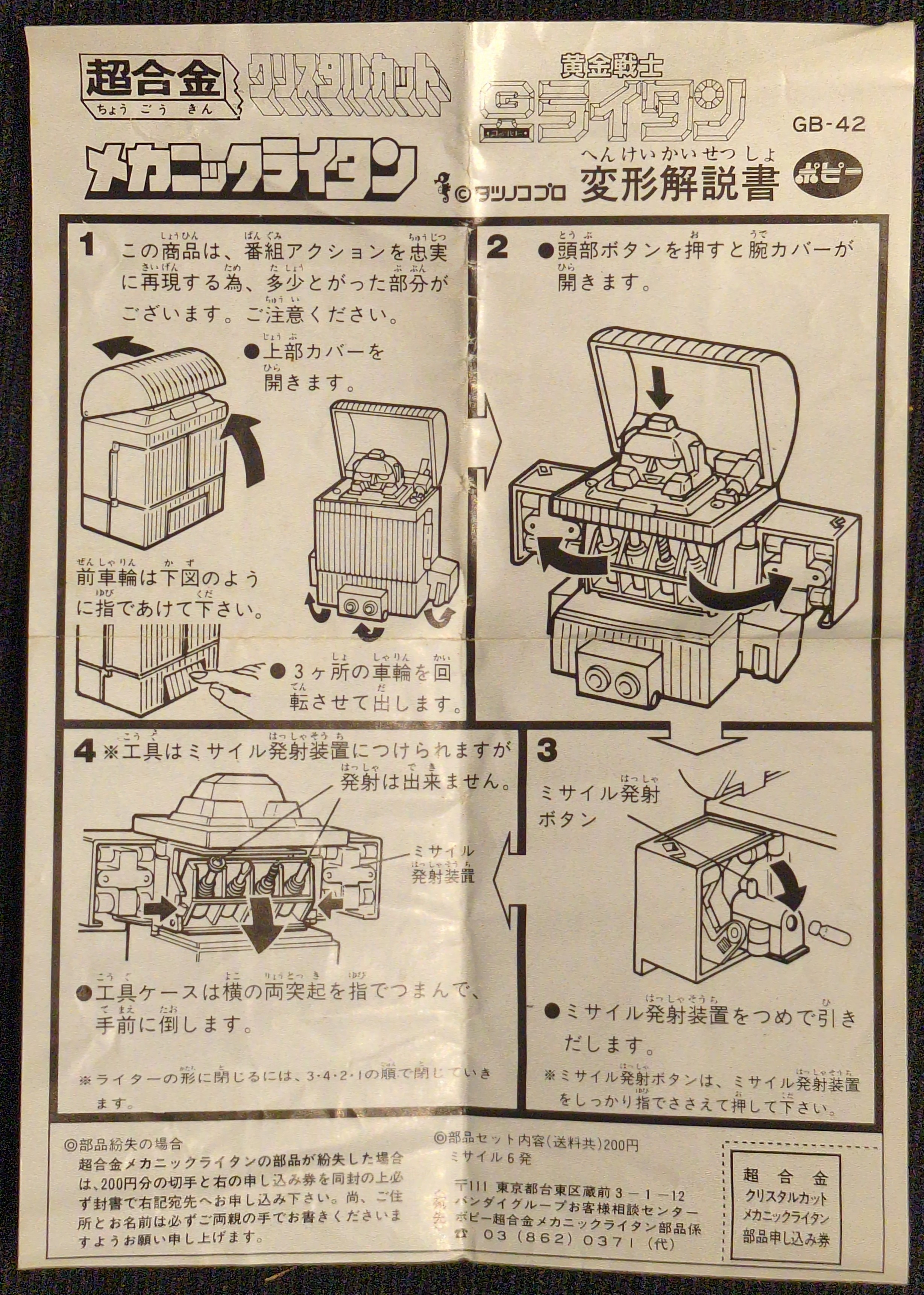 商品状態: 開封 箱イタミ・潰れ・破れ・スレ ディスプレイカード折れ・カビ 本体イタミ・スレ・メッキイタミ ミサイル・工具2本・上蓋・カタログ欠