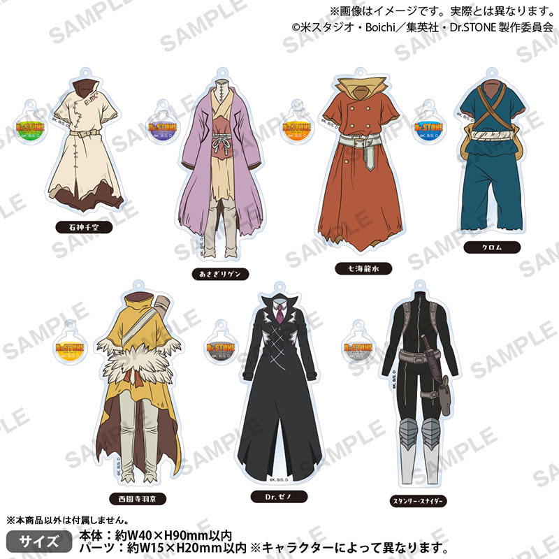 TVアニメ『Dr.STONE』より、衣装アクリルキーホルダーが登場! キャラクターが身に着ける衣装をモチーフにしたアクリルキーホルダーに、丸底フラスコチャームが付属します!