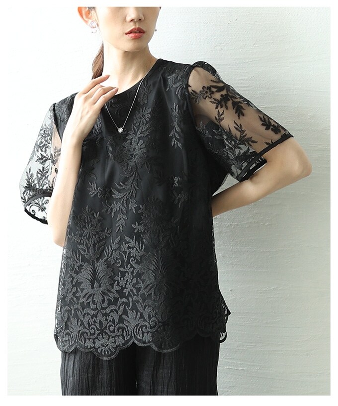 【韓国製】マキ 黒 ブラック ビジュー パール スパンコール シフォン シアー 透け感 半袖ブラウス カットソー トップス レディース【c055】