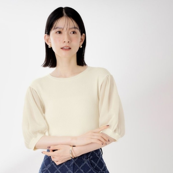 袖部分がシアー素材になっていることで、控えめながらも洗練されたキレイ目ニットです。