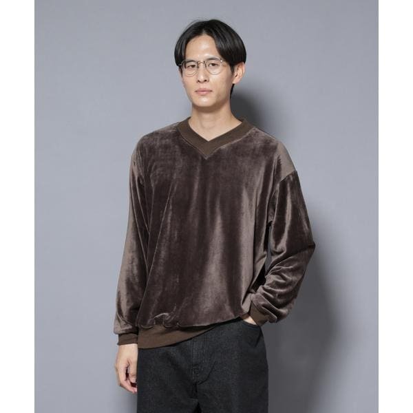 程よい光沢感が魅力のベロア素材を使用したVネックプルオーバー。程よいゆとりのあるシルエットとVネックの抜け感が相まってこなれた印象を演出。カジュアルなスウェットながらも、ベロアの上品さでワンランク上のスタイリングができる一着です。