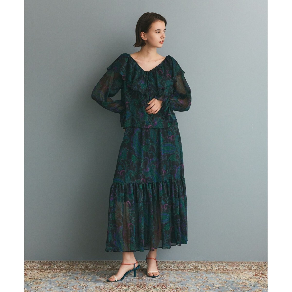 そこにオリジナルのヴィンテージ感のあるペイズリー柄をのせた、美しい佇まいの一枚です。大人っぽく深い色にする事で、Grace Classらしい上品なボヘミアンスタイルを楽しめるデザインに仕上げました。たっぷり用尺をとった贅沢なラッフルフリルやゆったりとした優しいシルエットが、装いを可憐に印象付けます。紐の先端にはメタルを飾って洗練感をプラス。お揃いでお作りしたスカートと合わせる事で、ワンピース風の着こなしもお楽しみいただけます。