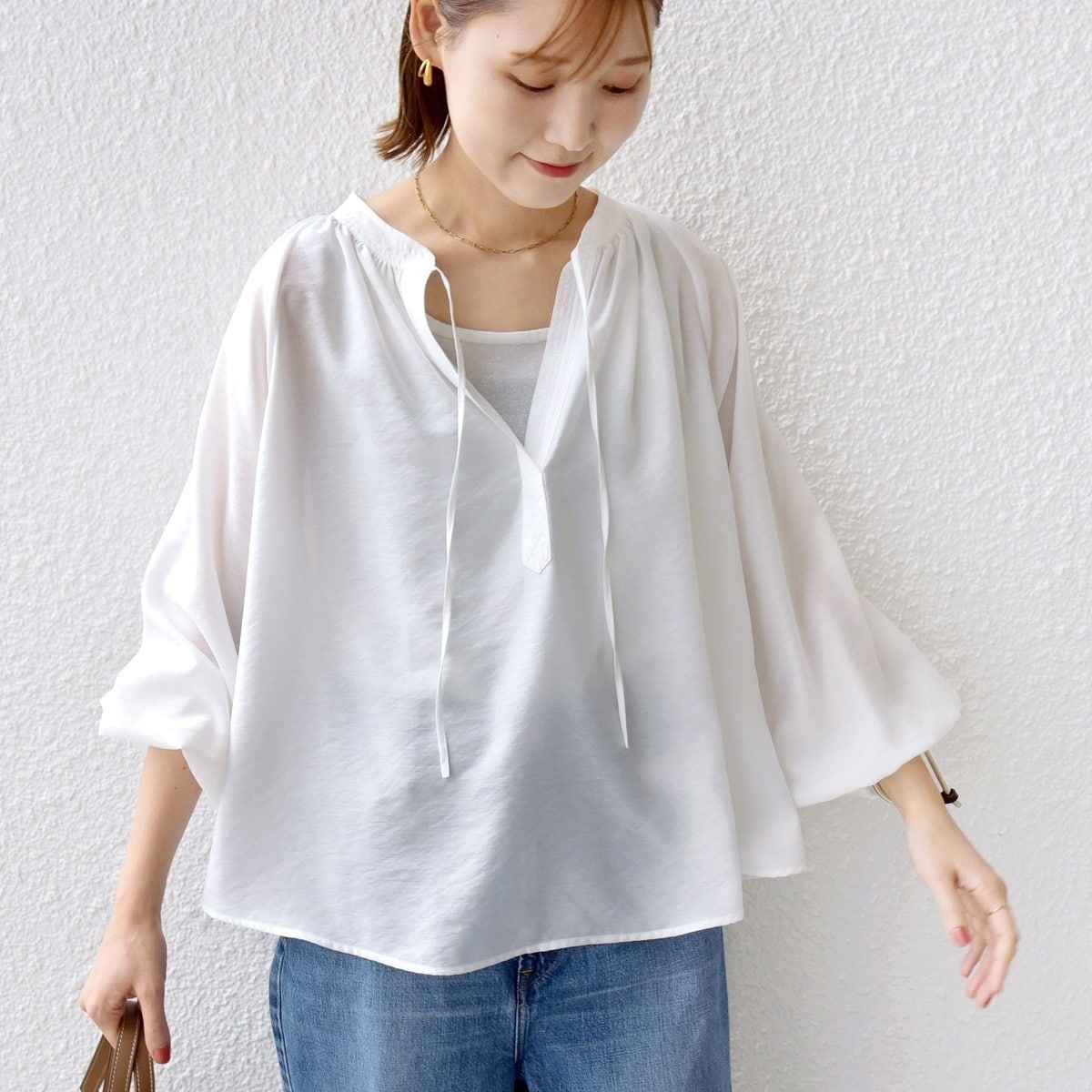 袖のボリューム感と全体のギャザーがポイントとなるため、華やかに見えるブラウスです。