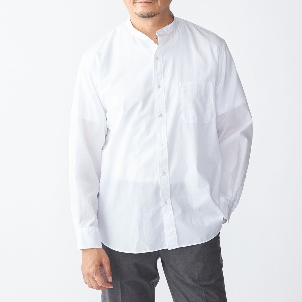 ドレスシャツにも使われるような細番手の糸を使用したバンドカラーシャツ