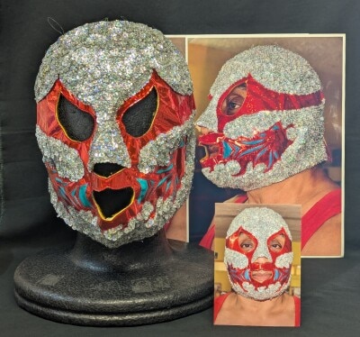 プロレスマスク サンチェス製 【エル・カネック (銀スパンコール×青緑・赤メタ特殊フチ)】 本人使用 サイン入り 着用写真付き
