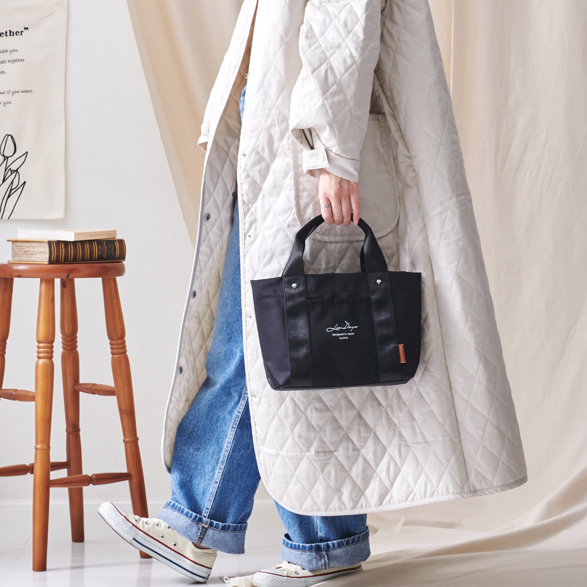 LIZDAYS 仕切り付きキャンバスミニトートバッグ ベージュ×ブラック