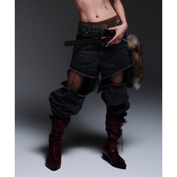太ももから膝にかけてのフロントを大胆にカットアウトしたデニムパンツ。