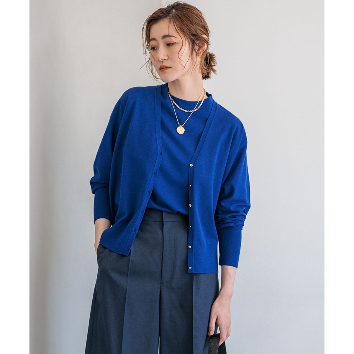 ドルマンスリーブのニットカーディガン。袖口に入ったスリットがポイントで、前を閉めてプルオーバーとしても、カーディガンとしても着用できるアイテムです。短めの丈でワイドパンツにもスカートにも合わせやすくしています。同素材のスカートとの組み合わせもおすすめです。カラーは、ライトグレー(#003)、ブラック(#005)、レッド(#010)、ダークブラウン(#035)、ブルー(#070)、ダルブルー(#074)の6色展開です。