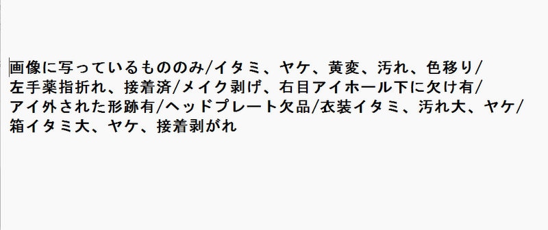 | 画像に写っているもののみ/イタミ、ヤケ、黄変、汚れ、色移り/左手薬指折れ、接着済/メイク剥げ、右目アイホール下に欠け有/アイ外された形跡有/ヘッドプレート欠品/衣装イタミ、汚れ大、ヤケ/箱イタミ大、ヤケ、接着剥がれ メール便での配配送遅延・商品紛失・破損・返品・交換等の補償は、弊社では一切の責任を負いかねます。またネコポス以外のサービスでは、配送業者でも上記の補償は負いかねます。 【ドール買取情報】 【魔法少女&変身少女TOY買取情報】 【セーラームーン 関連各ジャンル買取情報】 *SAL shipping method is not available for this item due to size/weight limitations. *all items are second hand and sold “AS IS” condition please expect minor stain/damage on both package and contents *no responsibility will be taken for manufacturer defects *image(s) are for reference only *storefront item(s) may be out of stock without prior notice *shipping overseas might cause damage order at your own risk |