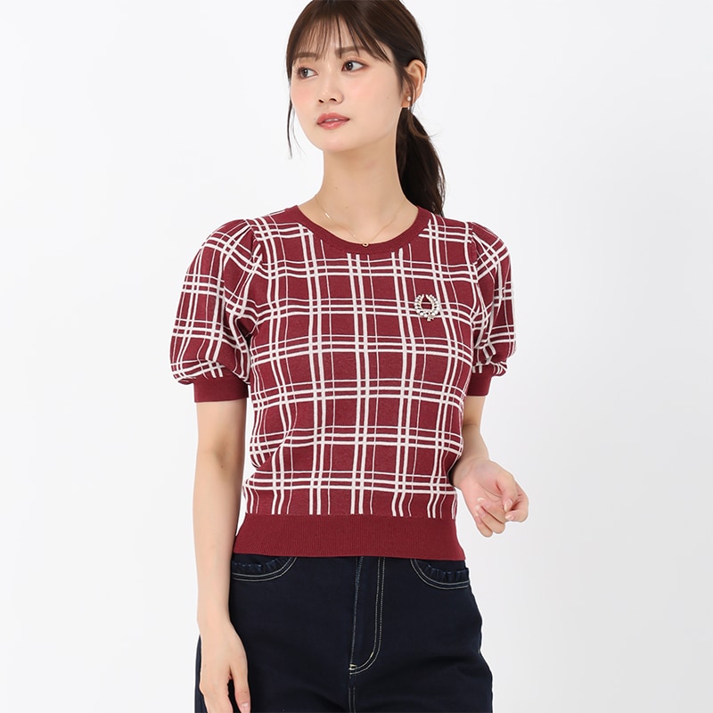 ラメがキラめくチェックジャカードニット。胸にはブローチのアクセントをプラスしました。柔らかなふくらみのあるパフ袖で気になる二の腕ラインをカバー。カジュアルなデニムやフェミニンなスカートなど、様々なアイテムとも合わせやすい1着です。■fabric透け感[無し]裏地[すべて有り]伸縮性[有り]生地の厚さ[普通]