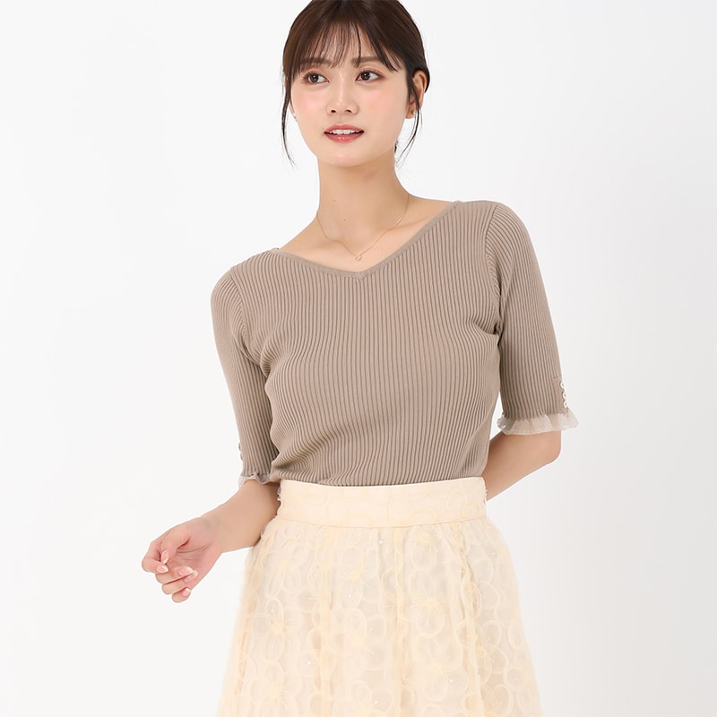 袖と裾のシアーフリルが甘さをプラスするリブニット。前後どちらでも着用可能な2WAY仕様になっており、1着で着こなしの幅も広がります。伸縮性のあるリブ編みでフィットする着心地の良さも魅力ポイント。カジュアルからキレイめな着こなしにと幅広く活躍してくれるアイテムです。■fabric透け感[無し]裏地[無し]伸縮性[無し]生地の厚さ[普通]