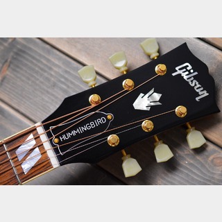 スクエアショルダーのボディにハチドリが描かれた特製ピックガード。同社のDOVEと外観は似ていますが音や弾きやすさは全く違います。硬くパワフルなDOVEに比べてHummingbirdはハニートーンと呼ばれる甘い音色と短めの弦長(ミディアムスケール)による弾きやすさを持ち、弾き手に寄り添う優しさとGibsonの心地よい鳴りを兼ね備えたモデルとなっています。国内外を問わずプロのアーティストにも愛用者が多く、特にシンガーソングライターに支持されています。