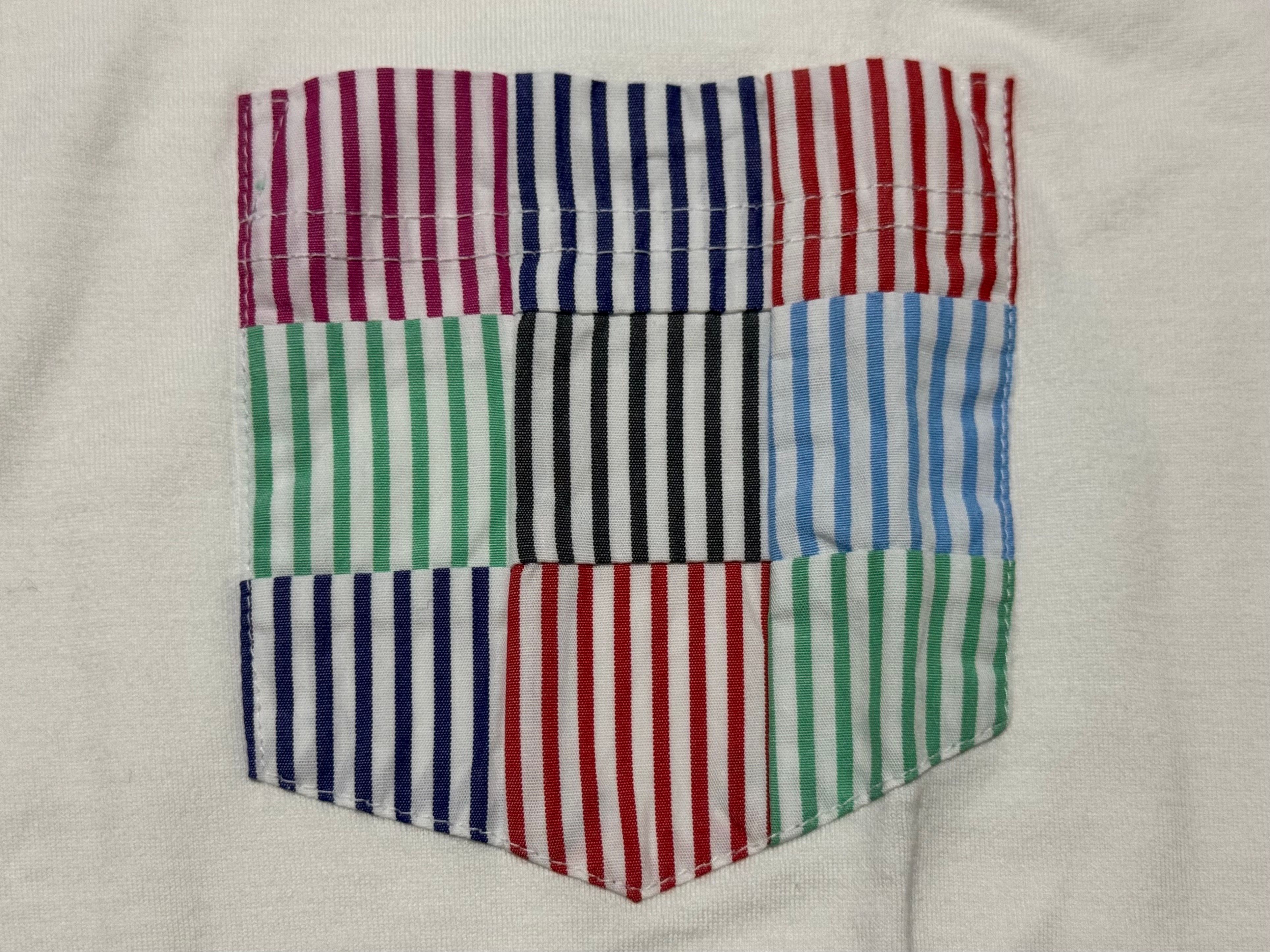 ホワイトのTシャツにチェック柄のパッチワークポケットデザイン。