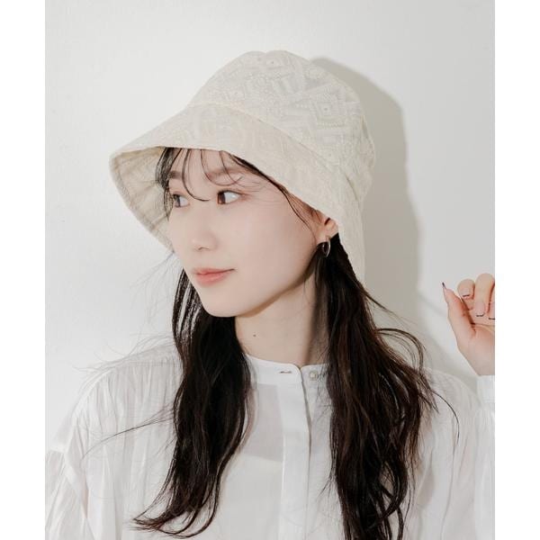 全体にレースをあしらった大人可愛いデザインのバケットハット。