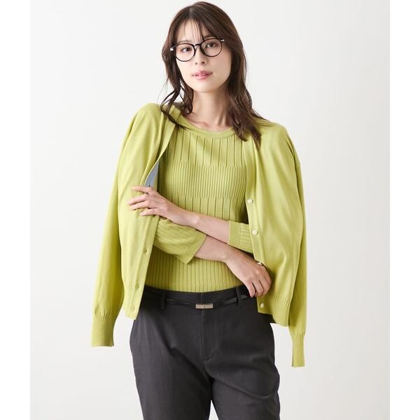 滑らかな表面感が洗練された印象を叶えるVネックカーディガン。ゆったりとしたシルエットでリラックスしてお召しいただけます。同素材のプルオーバー(品番:51726612)とのアンサンブルスタイルもおすすめ。カラーは鮮やかな発色が美しいイエローグリーン、シーンレスに活躍するネイビーの2色展開。