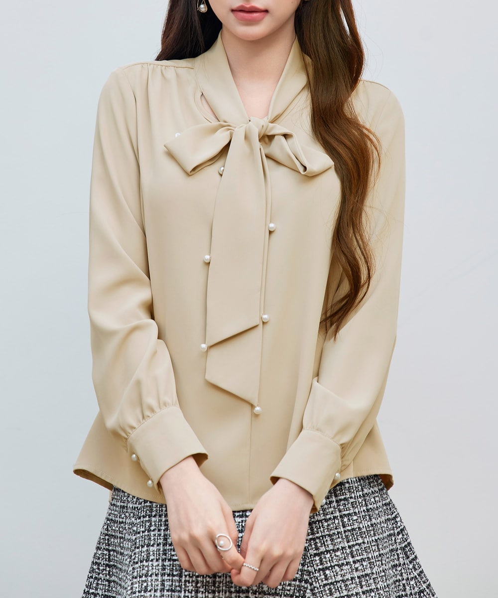 ネックは女性らしいボウタイリボンカラー。パールドットがあしらわれた幅広リボンが胸元をエレガントに飾ります。