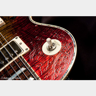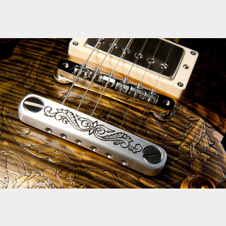 特に本モデル『 LP Figured 』は、アルミ板をハンマーで打ち出してボディのトップを成形し、そこに彫金を施し、本物の虎目にしか見えない独自の手法での製作技法を取っています。