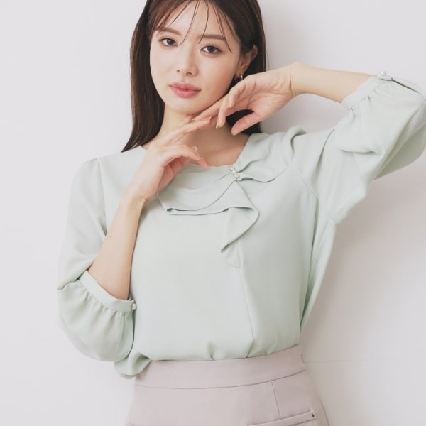 ・エレガントなパール調があしらわれたリボン風のフリルがアクセントの、洗練されたブラウス。