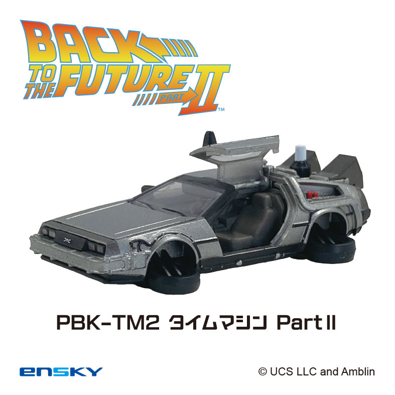 2025年12月に40周年を迎える『バック・トゥ・ザ・フューチャー』、映画本編に登場するタイムマシンを再現し、精密な作りにも関わらずプルバック走行ができる機構を組み込みました。このサイズでも両側ともガルウイングドアは開閉可能にし、内装も機器類を再現しています。リアにはフック穴を設けていますので、付属のキーホルダーをつけて持ち歩くこともできます。飾って楽しめるようにパッケージの内部をジオラマのような背景に仕上げています。