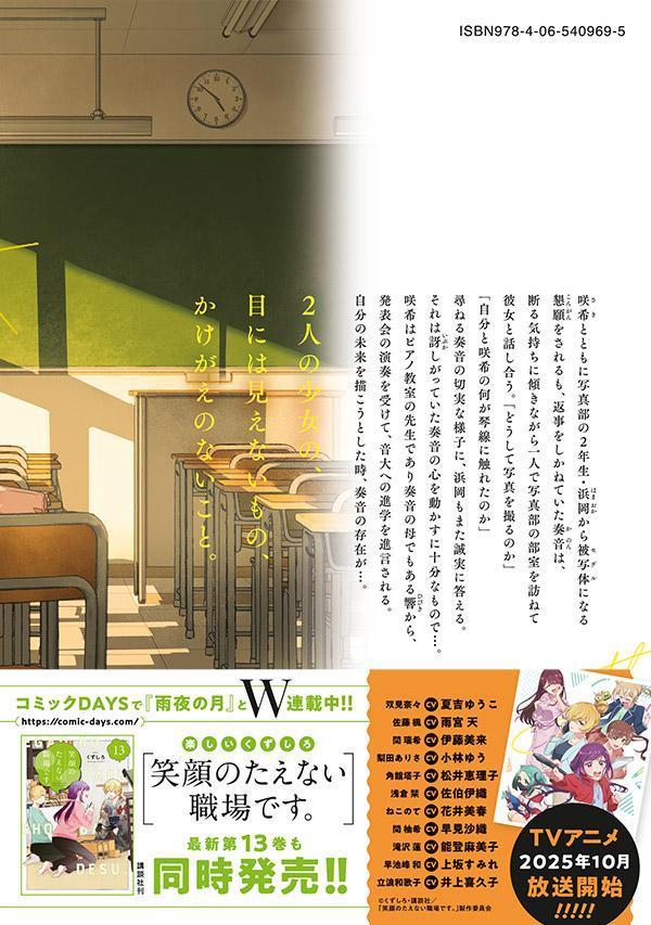 20以上の国で大反響! 各国の漫画賞に選出!TVアニメ制作中! 世界で配信予定!世界が見つめる、2人の少女の物語。咲希とともに写真部の2年生・浜岡から被写体(モデル)になる懇願をされるも、返事をしかねていた奏音は、断る気持ちに傾きながら一人で写真部の部室を訪ねて彼女と話し合う。「どうして写真を撮るのか」「自分と咲希の何が琴線に触れたのか」尋ねる奏音の切実な様子に、浜岡もまた誠実に答える。それは訝しがっていた奏音の心を動かすに十分なもので…。咲希はピアノ教室の先生であり奏音の母でもある響から、発表会の演奏を受けて、音大への進学を進言される。自分の未来を描こうとした時、奏音の存在が…。2人の少女の、目には見えないもの、かけがえのないこと。
