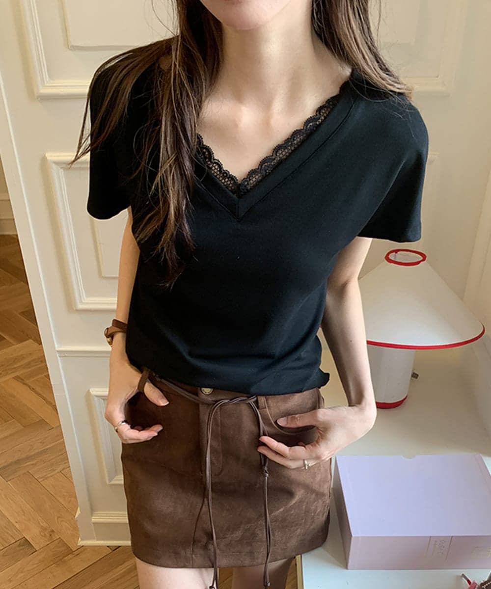 デコルテに繊細なレースをあしらった、フェミニンなVネック半袖トップス。