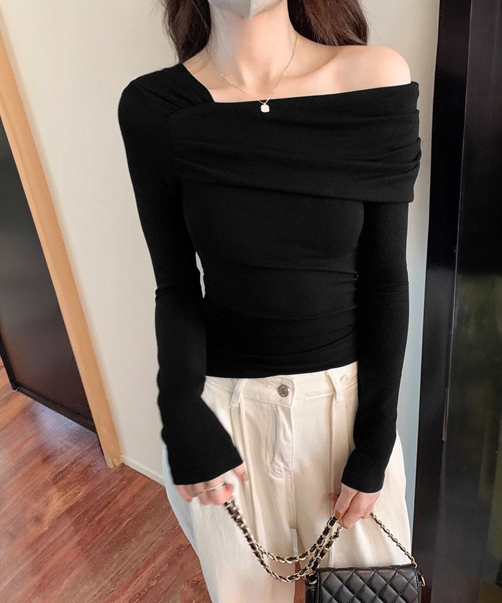アシンメトリーデザインが目を引く、オフショルダーのフィットトップス。