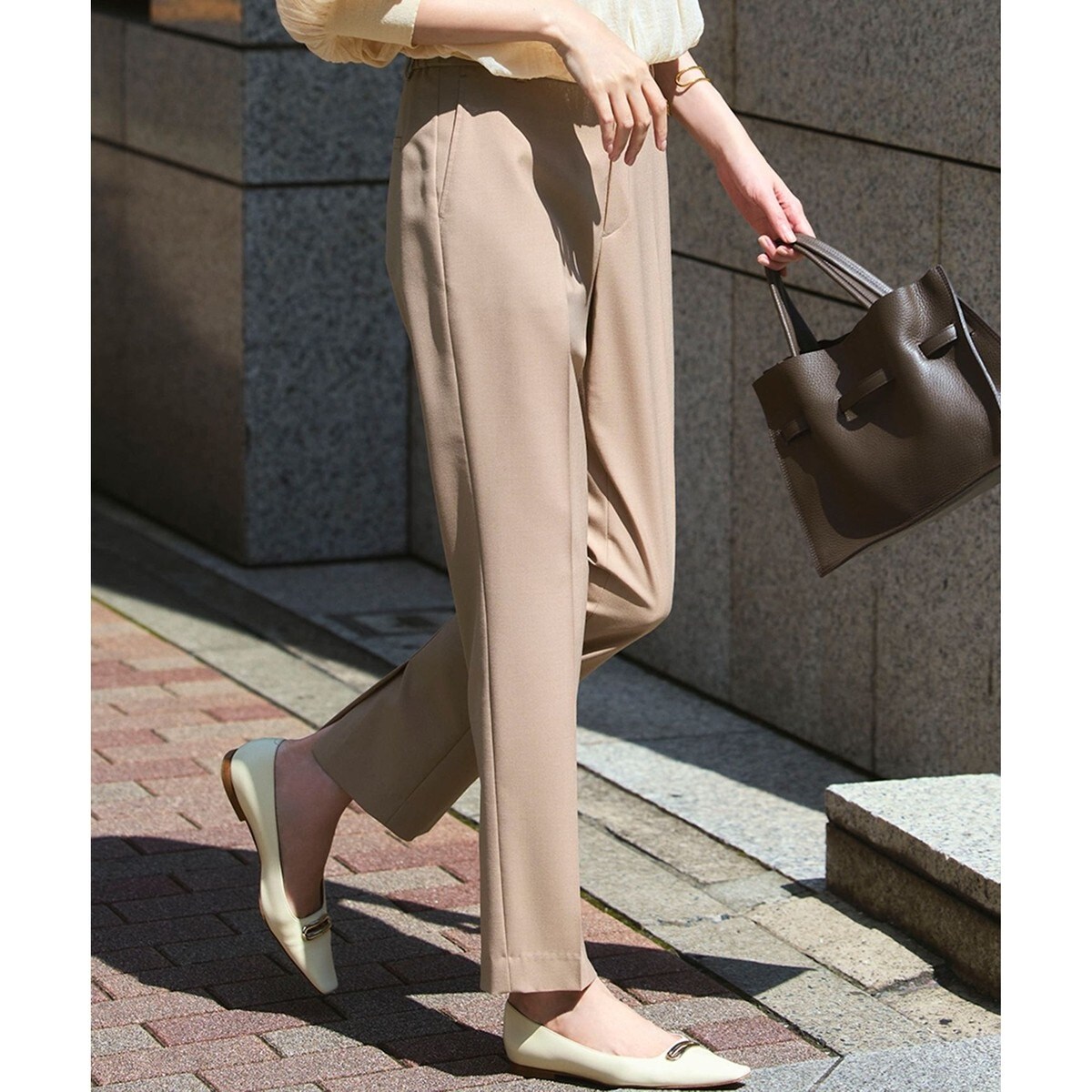 足元がすっきりとまとまるスリムなスティックパンツ。ジャケットやシャツなどと合わせたお仕事着から、カジュアルスタイルまで幅広く着回しがきくシンプルでミニマルなデザイン。前はすっきりと見せながらもウエストバックはゴム仕様で穿き心地良い仕上がりに。後ろの裾にはスリットを入れデザインのアクセントにしています。同素材のジレやポンチョシャツとのセットアップ着用もおすすめです。カラーは、上品でクラシカルなキャメル(#034)、こなれた印象のチャコール(#004)の2色展開です。